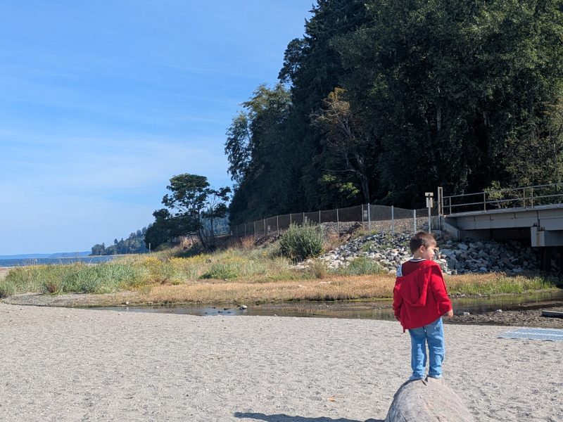 The trail winds through beautiful scenery and eventually opens up to the shore. Once we got there, my son wasted no time playing in the sand and exploring the scattered bits of driftwood and tree debris. It was pure joy watching him soak in the simple fun of being at the beach.